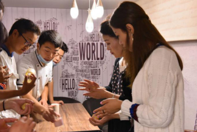 中外学子在烘焙坊里细心观察着糕点师的示范,桌子上摆放着和好的面团、月饼馅、模具、包装盒等材料,包馅、压膜、烘焙、装袋,一个标准的月饼展现在大家面前,糕点师熟练的技艺赢得了周边同学们的阵阵掌声,不少人开始摩拳擦掌跟着做了起来。