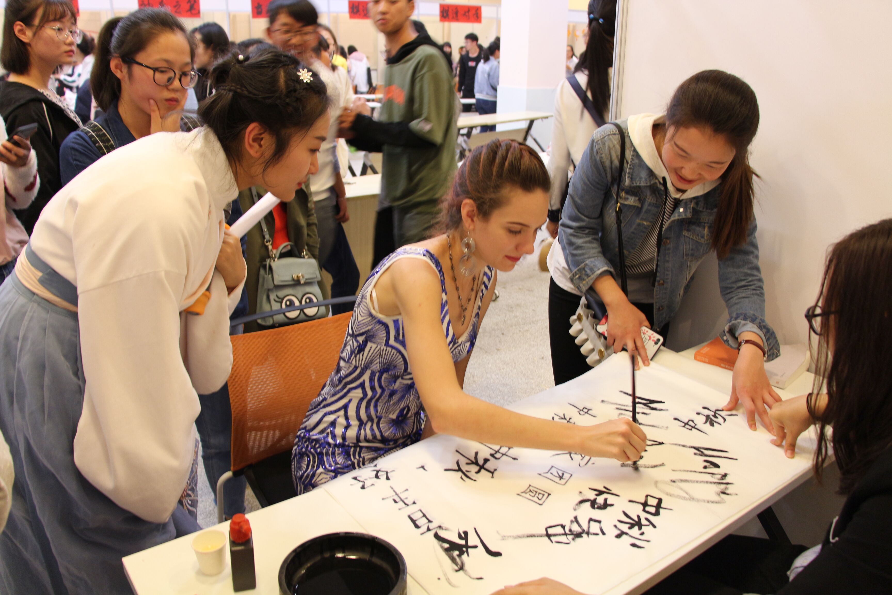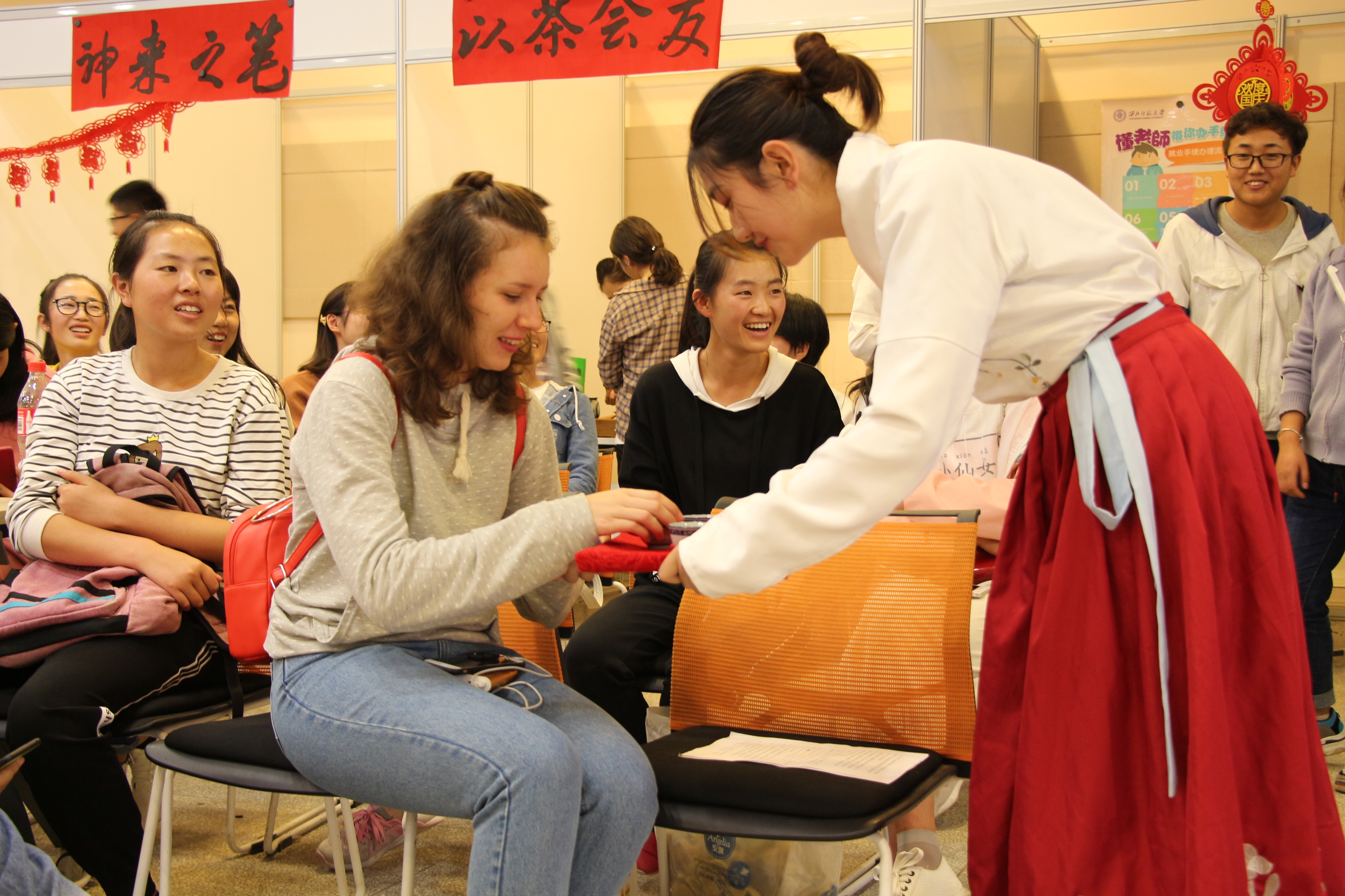 来自摩尔多瓦的职工王琳在“神来之笔”展位中熟练地提起砚台上的毛笔蘸了蘸墨汁,写下“中秋快乐”四个字。虽然笔画顺序不一定正确,但王琳写得十分认真。“我特别喜欢这样的活动,很荣幸能够成为今天活动的主持人,虽然我的汉语不太好,但是同学们很欢迎我。”王琳说,她在中国已经五年了,现在是bevictor伟德的一名研究生,这五年让她深深的爱上了中国。bevictor伟德2018级新生邱文静在“当局者迷”展位中取下灯谜思索片刻便说出了谜底,周围同学都惊叹他的猜谜功底,现场爆出一阵掌声和喝彩声。