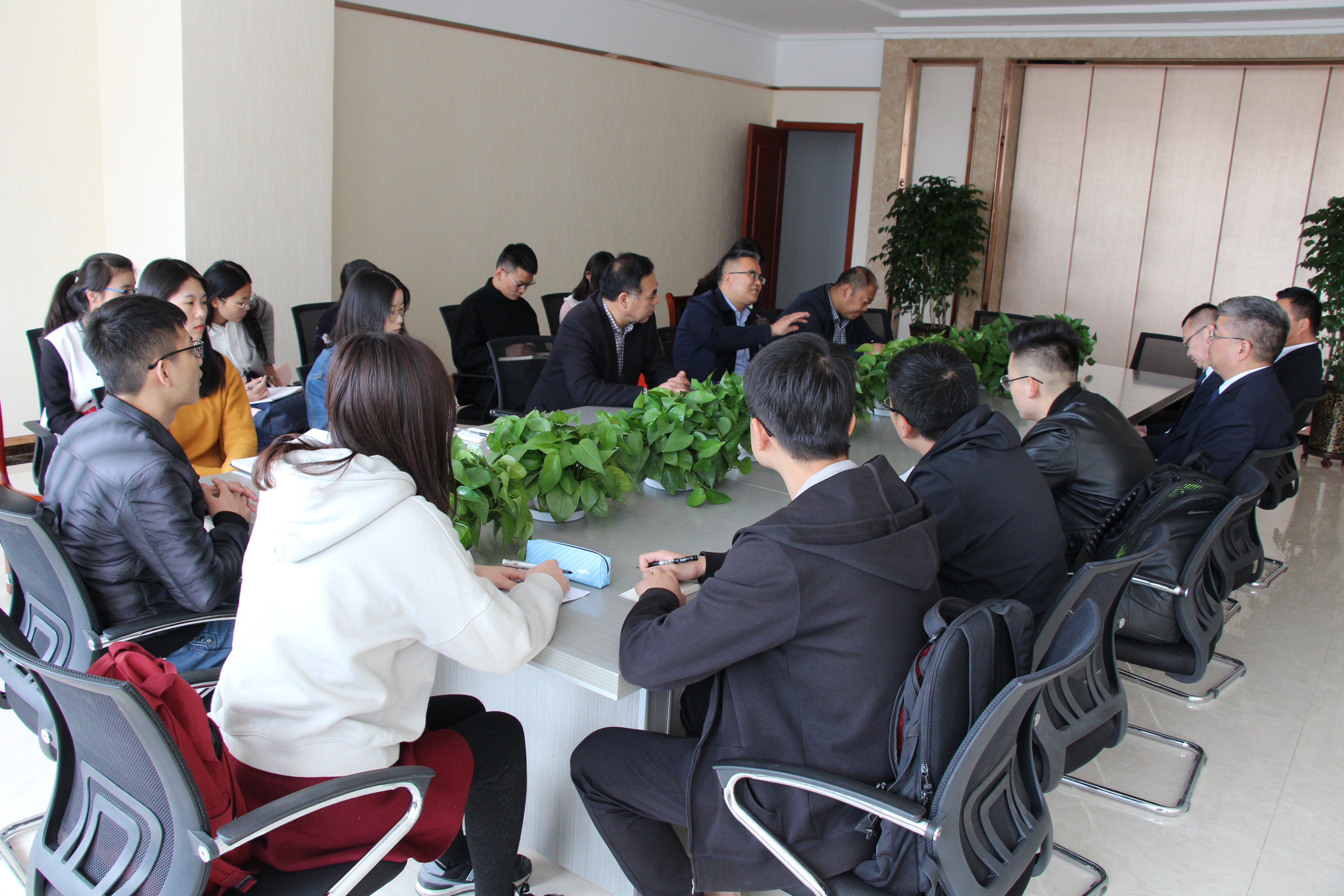 参观后召开了座谈会,公司党委书记高赟介绍了公司的办学情况,就员工就业、实习基地建设、联合培养人才、科学研究等方面提出了合作意向。四位经理和总监分别介绍了公司的投资、规模、技术、销售、市场、发展前景、管理理念等方面的情况,并回答了党员们提出的实体经济和民营企业面临的困境、亚太集团新领域的转型或补充、老员工职业规划等方面的问题。